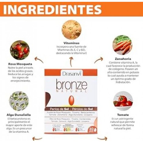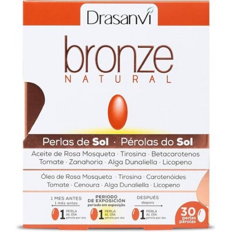 Bronze Natural es un complemento alimenticio a base de aceite de Rosa de Mosqueta, rica en ácidos grasos esenciales, extracto seco de Tomate, Zanahoria y Alga Dunaliella, extractos ricos en pigmentos como el Licopeno, Betacarotenos y Luteína.Además, incorpora una fuente de Vitaminas (A, E, C y B2), destacando la Vitamina E, que contribuye a la protección de las células frente al daño oxidativo. Por su importancia, es necesario mencionar la presencia del aminoácido L-tirosina, precursor de la Melanina (pigmento responsable del color de la piel).