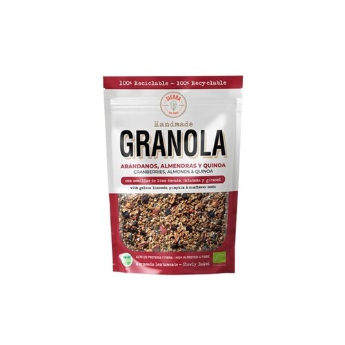 Deliciosa granola de arándanos rojos, almendras y quinoa de Espacio Orgánico. Una combinación perfecta para un desayuno saludable y nutritivo. ¡Prueba la granola de 300g de Sierra!