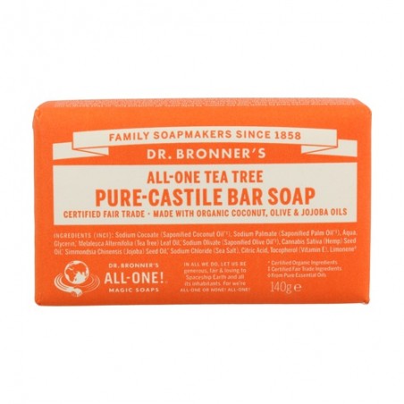 El jabón de Barra Puro de Castilla árbol del té de Dr. Bronners está hecho con ingredientes certificados para una espuma suave y lisa que no secará su piel. El aceite de árbol de té es un limpiador que ayuda en caso de contusiones, problemas de la piel tales como espinillas y piel atópica. Todos los aceites y aceites esenciales han sido certificados. Envuelto en papel reciclado al 100%. Limpian suavemente y con eficacia. Producen una espuma aterciopelada que deja la piel suave como la seda. Los jabones han sido certificados por Oregon Tilth.
